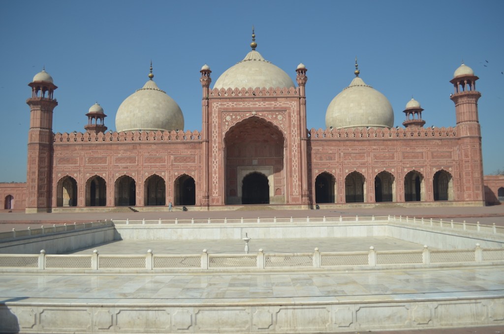 From the gateway one enters into the courtyard measures 530 feet on each sides. It is flanked eighty cloisters on all sides. The courtyard consists of two parts. The lower part contain ablution tank. Few years back, the floor of the mosque was laid out in small bricks, making a pattern of musalla but now it is replaced by red sandstone. The prayer chamber lies on a high plinth in the middle of the western edge of the courtyard. The front façade contain high pishtaq in the middle flanked by five arched opening on either sides set in the general roof line of prayer hall. The main arch of the pishtad is framed with marble inlay while the spandrel of the arch has delicate floral arabesque. There are rectangular panels above the smaller arches and decorated with inlay work. The hardness of red sandstone is beautifully soften up with marble inlay work. The corners of the prayer chamber are marked by four smaller minarets with projected platforms surmounted by domed kiosks. The parapet is formed by horizontal row of merlons. The main iwan of prayer hall is flanked by side spaces. The interior of the prayer chamber is surmounted by three bulbous double domes of white marble and rest on cylindrical drums. The central dome is higher than the two on its either sides.
