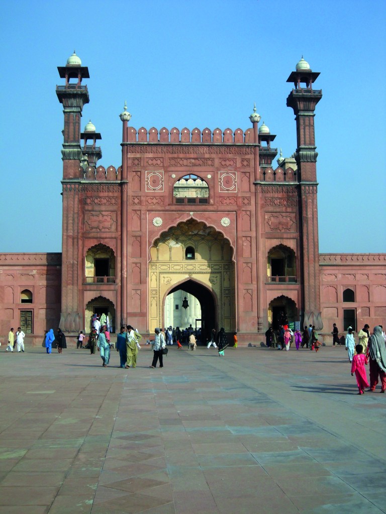 Badshahi Masjid (1084 AH/1673-74 AD) is one of the most impressive contribution of Aurangzeb period. Visually it echoes the Jamia mosque of Shah Jahanabad and Fatehpur Sikri in terms of basic design concepts and use of materials. The main entrance two storeyed high faces the east and entrance platform is approached by 22 steps forming three-sided pyramid. The central pishtaq and flaking bays on the either sides have a pair of small arched niches placed vertically one above the other. The entire construction of mosque in brickwork is clad with red sandstone inlaid with white marble. The façade is divided into rectangular panels carved in low relief. Pair of square shafts is attached to the sides of the slightly projecting central bay and terminate above the roof with white marble domelets. The four corner minarets terminate in a wide projected platforms over which rests square kiosks. A tablet of white marble above the pishtaq has the following inscription (besides the Kalima Tayyaba): “The mosque of Abu Zafar Mohiuddin Muhammad Alamgir, the Ghazi King, completed under the superintendence of the humblest servant of the household, Fidai Khan Koka, in 1084 AH31