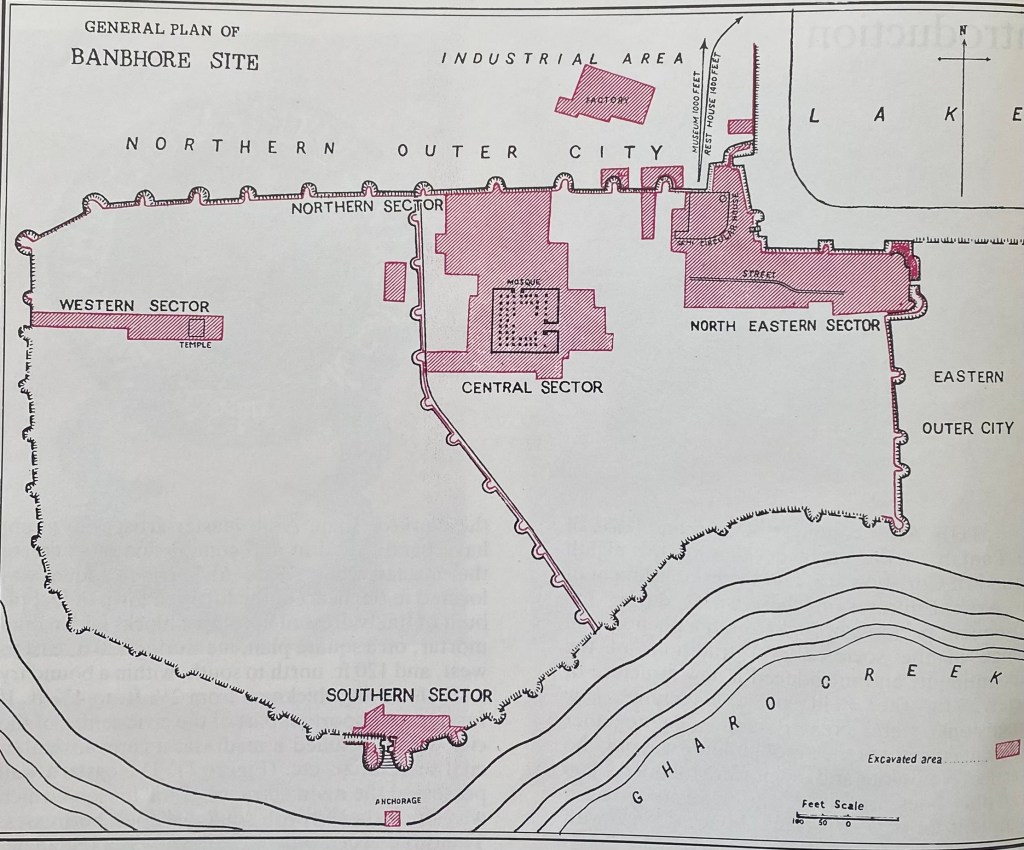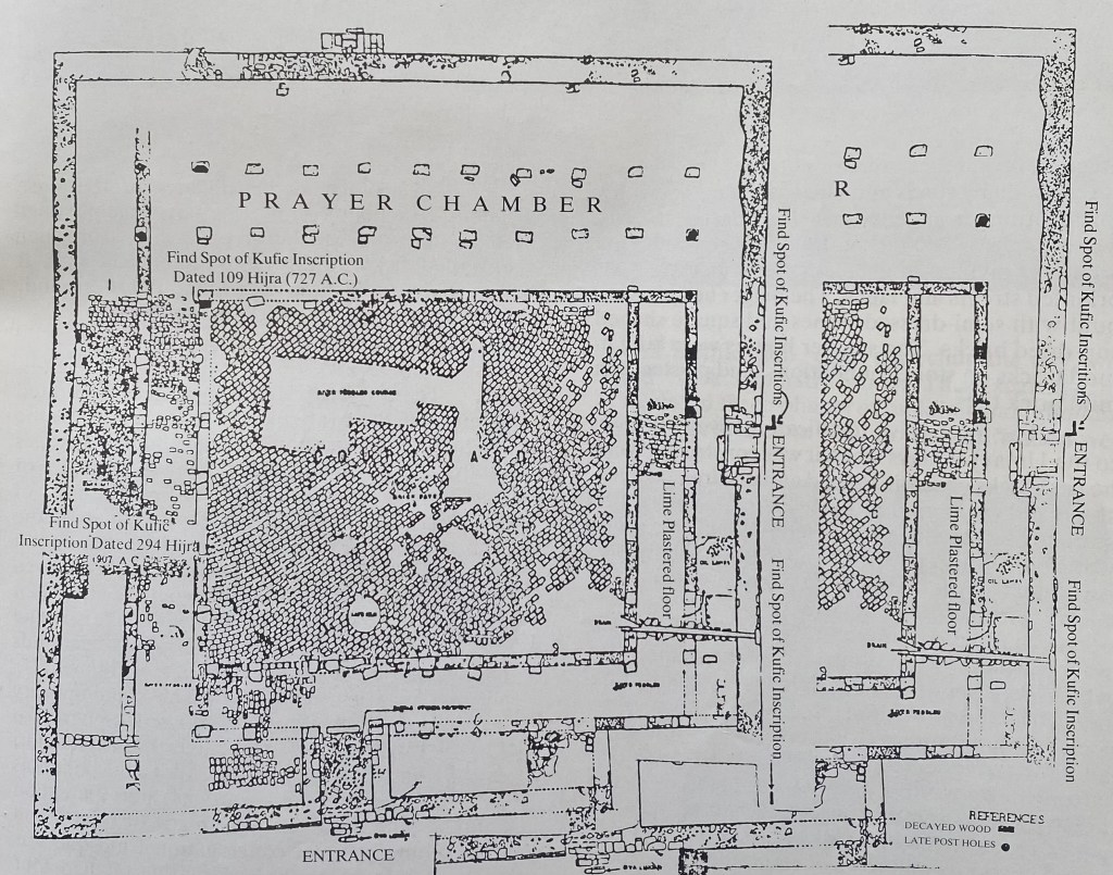 The city was surrounded by stone and mud wall. The city was divided into eastern and western part by a stone wall. Remains of the one of the earliest known mosques in the region dates back to 727 AD have been found in the eastern part of the city. The city was enclosed by stone wall with three gateways. in addition, 13 Kufic inscriptions have also been found from the mosque. Close to the mosque the remains of semi-circular palace have also been found which is believe to the the Governor Palace. Remains of houses, streets, and other buildings have been found both within and outside the citadel.In addition remain of Shiva temple have also been identified from the remains of Hindu period.