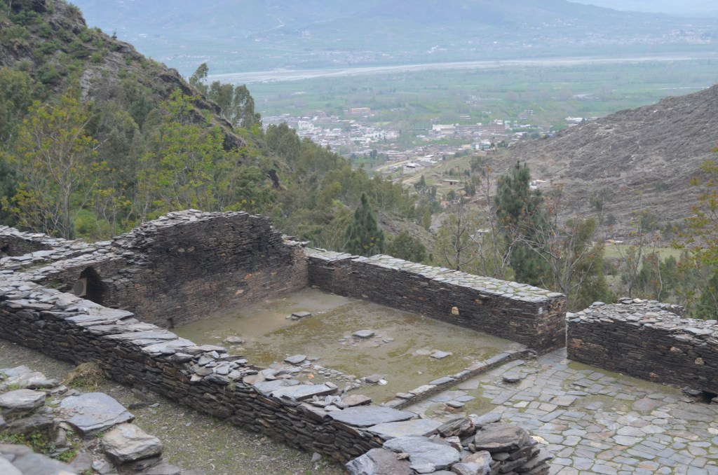 The Udegram mosque stands about 320 feet lower than the so-called ‘Castle’, a defensive structure that occupies the rocky spur of the mountain with an extensive wall-circuit, dominating a large area of the valley. It was founded at the end of the 5th century AD, but major occupation of the site on the basis of superimposed structures of Hindu Shahiya Period belonged to the 7th-10th centuries AD following the Muslim conquest at the beginning of the 11th century and lasting with the arrival of the Mongolian hordes at the end of the 13th century. The original mosque foundation, maybe smaller than the actual, was founded soon after the Mahmūd’s conquest in the first decade of the 11th century. The mosque probably have been subsequently enlarged to its final shape when marble inscription in Arabic, was fixed at site. The early Muslim invaders in most often cases constructed mosque to commemorate the victory and built houses to make firm control over the area by the settlement of the population. The same was the case with the Udegram mosque. The excavation at site revealed three distinct phases of occupation, i.e., the Gandharan period, the Hindu Shahiya period and Islamic period. The inscriptional evidence explicitly associates the construction of the Udigram mosque with a Ghaznavid’s governor named Anushtigin, dated 440 AH/ 1048-9 AD.