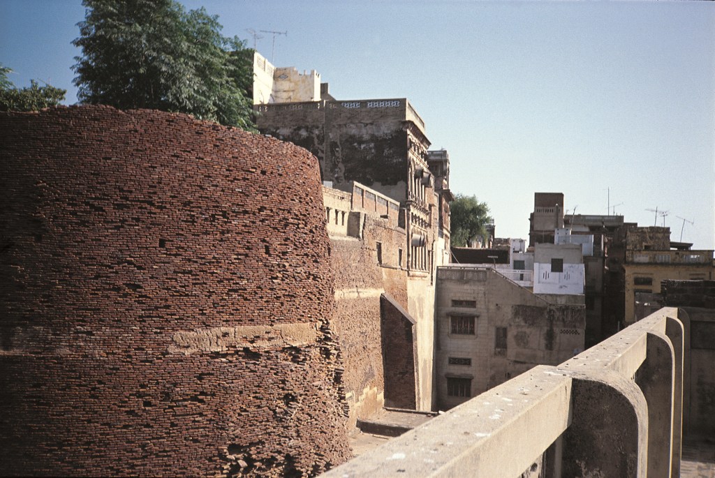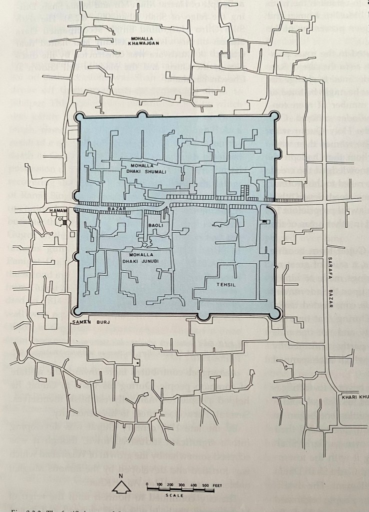 The Gujrat fort is square plan, 1600 feet by 1600 feet. It was strengthened with four corner towers and two each on north and south sides. Two entrance gates were constructed on the east and west sides. A bazaar connects these gates. A hammam (akbari Hammam) was constructed outside the Kabuli (western) gate and baoli was built in the center of the town with access from the bazaar for the convenience of the travelers and local residents. the construction was carried out under the supervision of Dianat Rai and Wazir Khan.