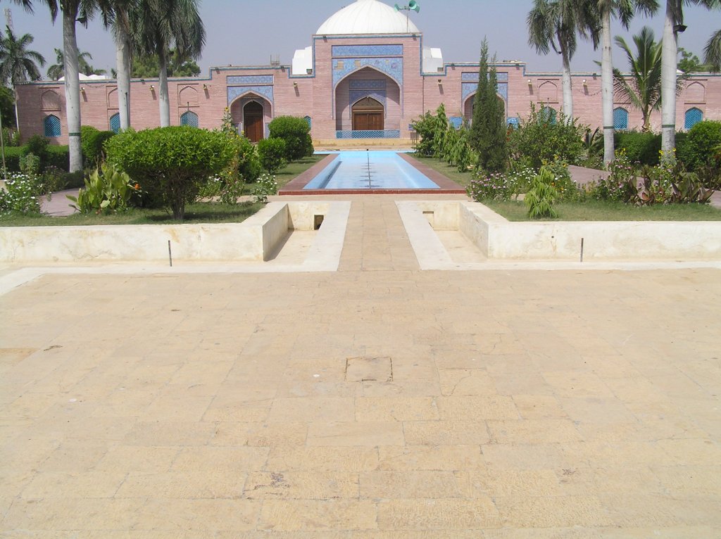 The most significant monument of the Shah Jahan period in Sindh is the Shah Jahan Mosque at Thatta. It was built between 1644 to 1647 AD on the order of the emperor. The mosque may have been constructed in part to reverse the effects of a devastating storm that had swept through the city in 1637 AD. The construction begun by Nawab Gul Aqa Amir Khan on the order of Shah Jahan. The usual careful crafting of this brick structure and its magnificent profuse tilework suggest that the mosque was subsidized by imperial coffers. The plan of the prayer chamber and even elevation derive from the Timurid design tradition. The eastern wing was added later in 1658 AD. The mosque measures 305 feet along east-west by 170 feet north-south axis. Around the great inner courtyard (are open domed halls. The hall on the western side is three bays deep and flanks the prayer chambers four on each side of the main prayer chamber. The riwaq on the north and south are two bay deep while the double bayed large domed halls on the east side forms the main entrance. The 93 domes, which cover the entire structure, are the cause of remarkable echo which enable the prayers in front of the mihrab to be heard in any part of the building. Unlike all other Mughal period mosques, the Thatta mosque does not have any minaret. The interior of the mosque is decorated with sun motives that serve to underscore the symbol of the dome as a representation of the heaven. Blue with white accent is primarily used, with the sparing addition of other colors especially yellow and purple. These pishtaq of the main iwan of prayer chamber is dominating the courtyard. The glazed tile work in Shah Jahan Mosque Thatta is the finest in the Indian subcontinent. Thin turquoise monochrome glazed tiles were used instead mortar for spaces between bricks. Binna’i technique was used in the soffit of the arches connecting three qibla domes chambers.