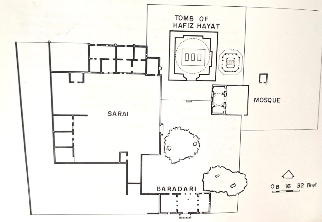 Khanqah of Hafiz Hayat is located in Gujrat District adjacent to the University of Gujrat. The saint settled in a remote settlement along the highway that connected Kabul with Indo Gangetic doab and areas beyond. The Khanqah is situated on a historic mound containing a baradari, a mosque, the tomb of the saint, and a residential building or saarai. The site is in dilapidated form and needs authentic conservation after careful archaeological investigations. The Khanqah is decorated with fresco paintings.