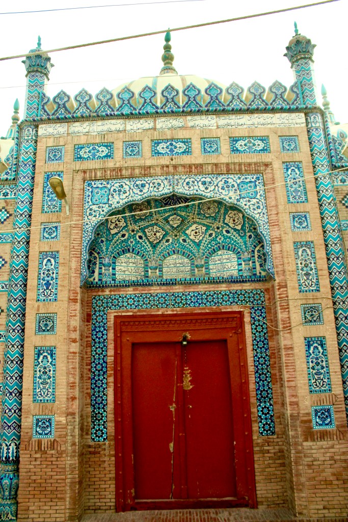 The Khudaka mosque is situated in a dense neighborhood near Chowk fawara about half mile West-South-West of the tomb of Shah Rukn-e Alam. It is a small structure aligned north-south having three bays covered with fluted domes. The central bay is bigger than the two on the either side. In the front facade, the central bay is defined with two slender shafts decorated with zig-zag pattern and topped with guldasta turrets with domelets in the middle. The building is profusely covered in traditional kashi-kari tiles having chahar khani designs in the exterior and fresco paintings on the interior. One unusual feature of the qibla wall in the interior of the mosque is the incorporation of ‘maps’ of Kahana Kaba and Masjid-e Nabvi and their surrounding as decorative elements on the interior, as found on the rear wall of the north and south bays. One map features a bird’s eye view of the Kaaba in Mecca, whereas another depicts a densely populated city. Overall, the mosque’s decorative treatment is typical of Multan school of architecture: the three-bay mosque, the use of geometric decoration, corner towers and chhatris, and the use of domes. In the interior the mosque is inscribed with Quranic verses ans Persian couplets. It is typical of 18th century mosque built in south Punjab. The proportion of the mosque are superb.