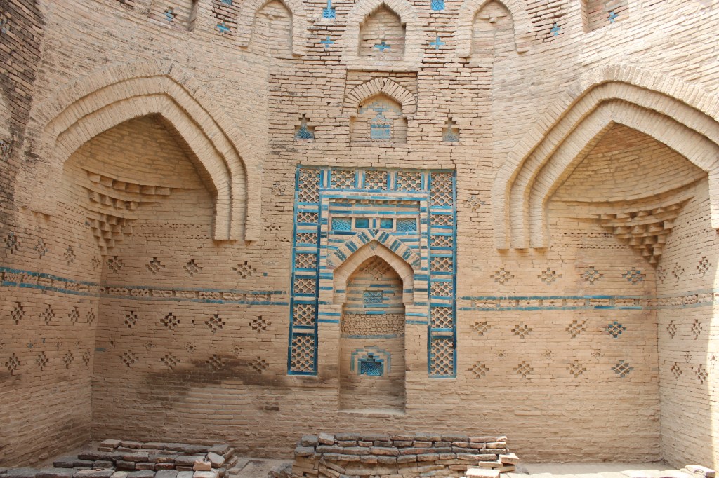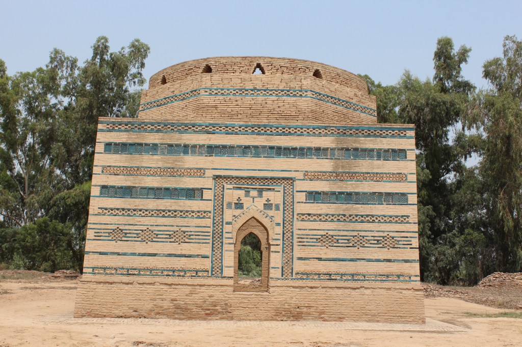 A group of four tombs in Lal Mahra Tomb Complex is located 24 miles from the villages of Puroa and Muhra near Dera Ismail Khan. The tombs were built around 14th century. The local site known, as Andira is a vast graveyard filled with both historic and contemporary tombs. The tombs are unique in their design and execution. These tombs A, B, C and D are of great historic and architectural value. These tombs are most significant and present a special but distinctive construction technique. Square in plan these tombs were constructed sometimes around early half of the fourteenth century. Tomb No 1and 2 has inward sloping circular towers at each corner which increase stability and grandeur to the building. Each tomb has arch entrances on three sides while the west side has mihrab set within the thickness of the wall. In case of tomb 1 and 2 these mihrabs project out from the western wall. The arched entrances are set within rectangular frames. The eastern entrance in each case, is regarded as main entrance, are more ornate than the other sides. The construction of walls was carried out in brick masonry. However, plain X shaped and glazed square terracotta plugs has also been used. In case of tomb-1 wooden wall plates have been used except the qibla side to avoid settlement of structure. In addition, four beams one at each corner above the squinch arches further strengthen the corner. The squinch arches as a zone of transition also have tetrahedron form of brick arrangement formed by overlapping of brick courses. In the tombs a wide variety of decorative designs have been used in the friezes and horizontal bands.