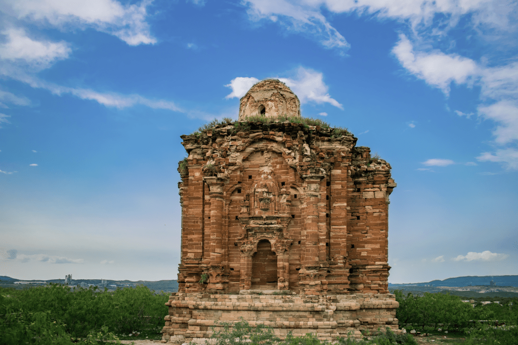 The temple of Malot is quite different in form from other temples. Alexander Cunningham described this temple as; “The only remains of any antiquity at Malot are a temple and gateway in the Kashmirian style of architecture. They are built of a coarse sandstone of various shades of ochreous red and yellow, and many parts have suffered severely from the action of the weather, the surface having altogether crumbled away…The temple is a square of 18 feet inside, with a vestibule or entrance porch on the east towards the gateway. The gateway is a massive building…divided into two rooms…On each side of these rooms to the north and south there are highly decorated niches for the reception of statues, similar to those in the portico of the temple. These niches are covered by trefoil arches which spring from flat pilasters. Each capital supports a statue of a lion under a half trefoil canopy. The roof is entirely gone; but judging from the square shape of the building, I conclude that it must have been pyramidal, outside with flat panelled ceilings of overlapping stones.”