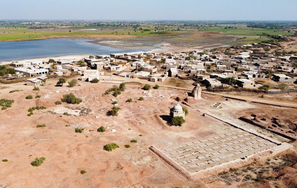 The Mahabat Khan mosque, the most important Mughal period mosque in Peshawar, is located inside the walled city of Peshawar in Andershehr Bazaar connecting Chowk Yadgar in the east and Asamai Gate in the west.10 It was built between 1660 AD and 1670 AD. The mosque has three gateways, the eastern gate lies in a lane that separates the mosque from the Sarai Mahabat Khan mosque while the southern gate connects the main bazaar. The prayer hall occupies the west side. The mosque has two tall minarets located on the two frontal corners of the prayer hall. The parapet wall rises from the outer edges, towards the center by a series of four small incremental height increases. There is a small minaret at the meeting point of two levels. In this way, there are six small decorative minarets on the façade of the prayer hall that flank the mosque’s 5 arched entryways. The three middle bays are surmounted with 3 fluted domes. The parapet is embellished with numerous merlons.