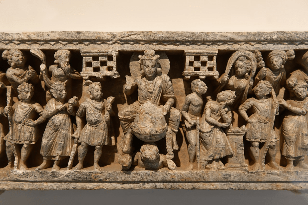 Among the discovered artifacts are images of Buddha, Bodhisattva, narrative reliefs, decorative and architectural elements, Buddha miracles, secular scenes, reliquaries, relic caskets and utilitarian objects. The muscular Atlas always supports pillars and brackets, naked cupids carrying a wreath, the gandharvi with musical instruments, winged creatures in triangular brackets, tritons, Amorini and numerous other narrative scenes. Domestic scenes of marriages, love making, hunting, wrestling, archery, groups of ascetics, warriors, processions of men, kings riding on a chariots and general enjoyment. Large-scale artifacts in Nimogram complex represent narrative scenes and decorative friezes, images of Buddha as well as Hindu deities.
