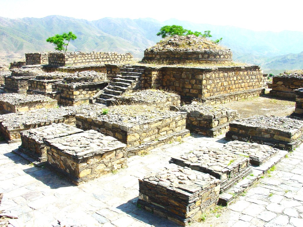There are three main stupas in row from north to south and 56 smaller stupas. There is also a monastery on the west of the main stupas. The stupas are believed to have been built in 2-3 century AD based on the discovery of coins from Kushan Period. Apart from the coins and pottery of Scytho-Parthian period, a large number of stone, stucco sculptures depict various scenes of Buddhist mythology were found near the stupa and placed in Swat Museum. These sculptures are on display in Swat Museum. There are a large number of stone carvings and sculptures signifying the Buddhist Mythology.