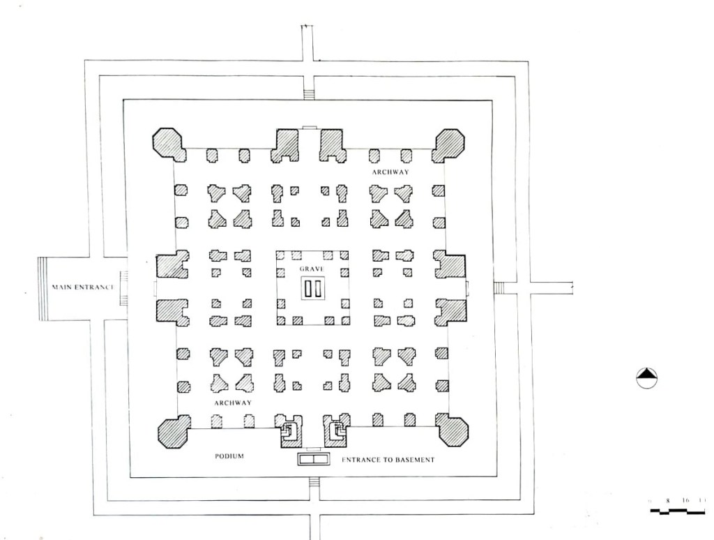 The Tomb of Nur Jahan; Nur Jahan with the real name of Mehr un Nisa, wife of Jahangir, died in Lahore on December 18, 1645. After a modest funeral she was buried in a tomb which she designed for herself. The tomb rest on square platform measures 134 feet on each side and slightly over 19 feet high. There are four octagonal towers at the corner to frame the front façade. The plan is based on fourfold symmetry. There are outer chambers on the exterior while the tomb is marked in the inner middle chamber. The grave of the empress and her daughter Ladli Bagum is located in the subterranean chamber. Deep opening slope downward provide light and ventilation to the tomb chamber. The interior of the tomb is beautiful decorated with stems of poppy and other flowers. The original outer finishes and flooring was stripped of by the Sikh in the late eighteenth century.