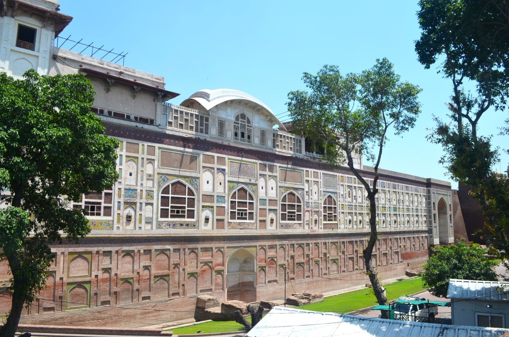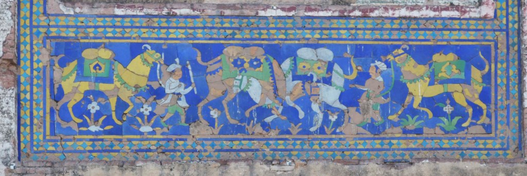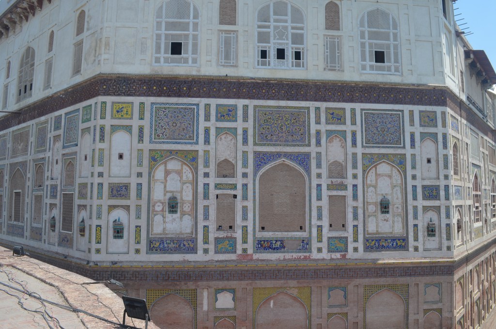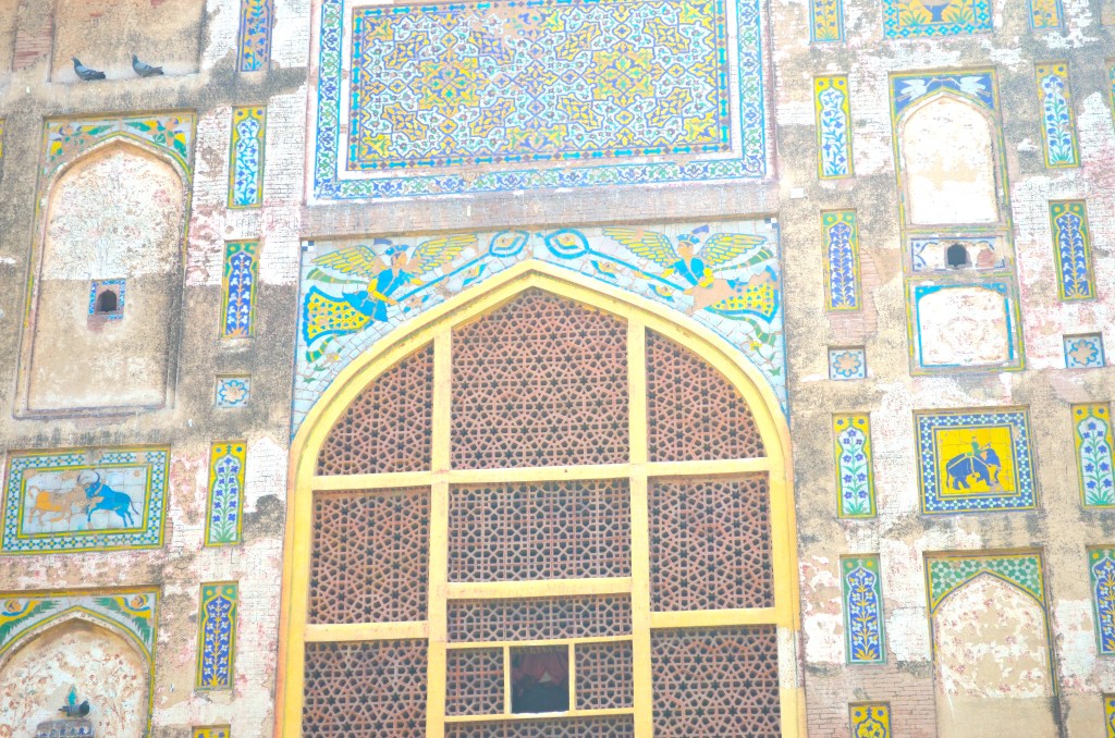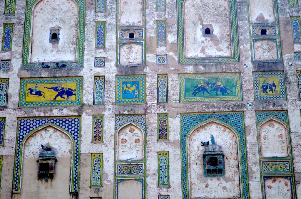 Picture Wall of the Lahore Fort covers the northern wall and partly the western wall of Lahore fort. It is the largest mural of its kind in the world. The Picture wall is 1,450 feet long with an average height of 50 ft. It runs from Elephant Gate (Hathi Pol Gate) to Jahangir’s Quadrangle of Lahore Fort. The Picture Wall has 116 mosaic pictures, depicting life and style of Mughal emperors, pictures of animals, birds, battles, hunting of deer with hounds and the dance and music of the royal court. . The picture wall was started by Jahangir, also shows the representation of zodiacal signs of angels, besides illustrations of dancing girls, conjurers, dragons, demons with cloven hoofs and birds, procession of loaded animals and horsemen. It is, in fact, the only Moghul building that has images of dragons, which were never thought to be in the imagination of people of sub-continent. The Picture Wall contained cuerda saca tiles, mosaic panels displaying imagery on different themes. The tiles are made up of the base of terracotta which could be rarely found elsewhere. It is pertinent to mention here, Picture Wall was the reason behind inclusion of Lahore Fort into World Heritage Monument in 1981 by UNESCO. Presently the restoration work is underway. Comprehensive documentation using 3D laser scanners along with total station’ is used to examine the minute details of Picture Wall.