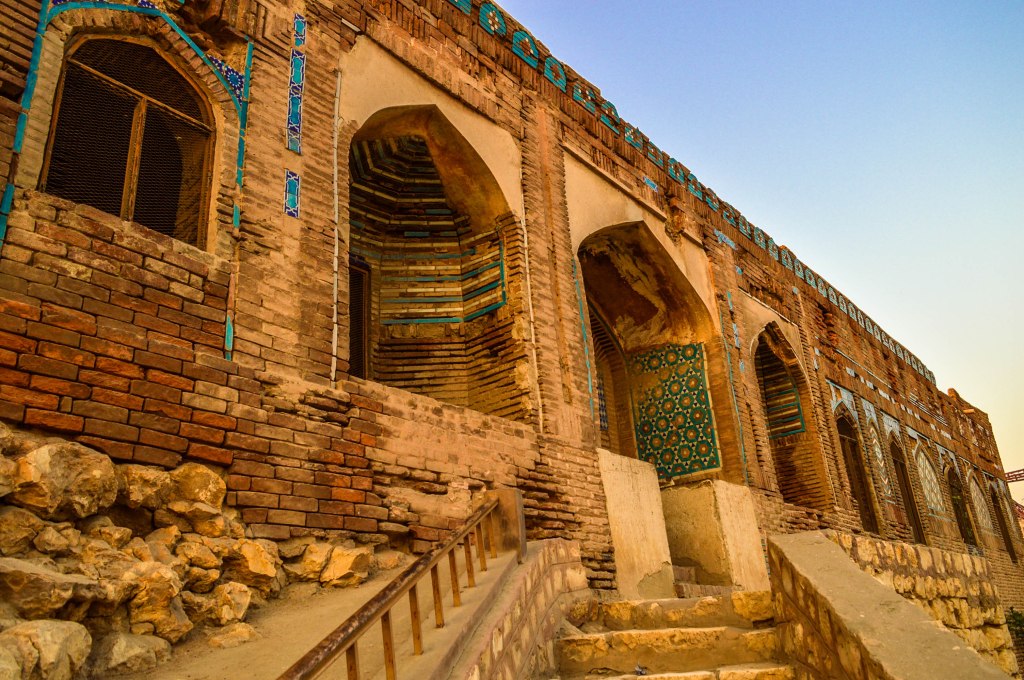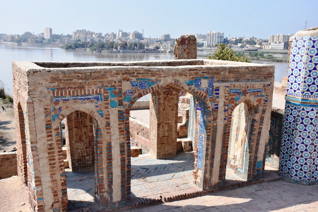 The ground floor accommodated rows of hujras probably for the convenience of travelers while the roof terrace contains numerous graves including the grave of Abdul Qasim Namkin. The building façade as well as passage leading to the roof terrace was decorated with blue tiles to enhance the beauty and aesthetic impact of the edifice. The entire construction of the building was carried out with yellow sandstone also used in Makli and elsewhere in Sindh. Quranic verses and Persian Inscriptions executed in Naskh style on the tombstones are one of the finest in the region. At the upper level a small mosque has also been constructed on the western edge of the roof terrace and is profusely embellished with blue, turquoise, and white tilework. The main entrance of the tomb lies on the south side while on the north river Indus flows gently after crossing the Lansdowne and Ayub bridges connecting Sukkur with Rohri. The tomb is decorated with blue and white glazed tiles in similar style found on the pavilion of Mir Masum in Sukhar.