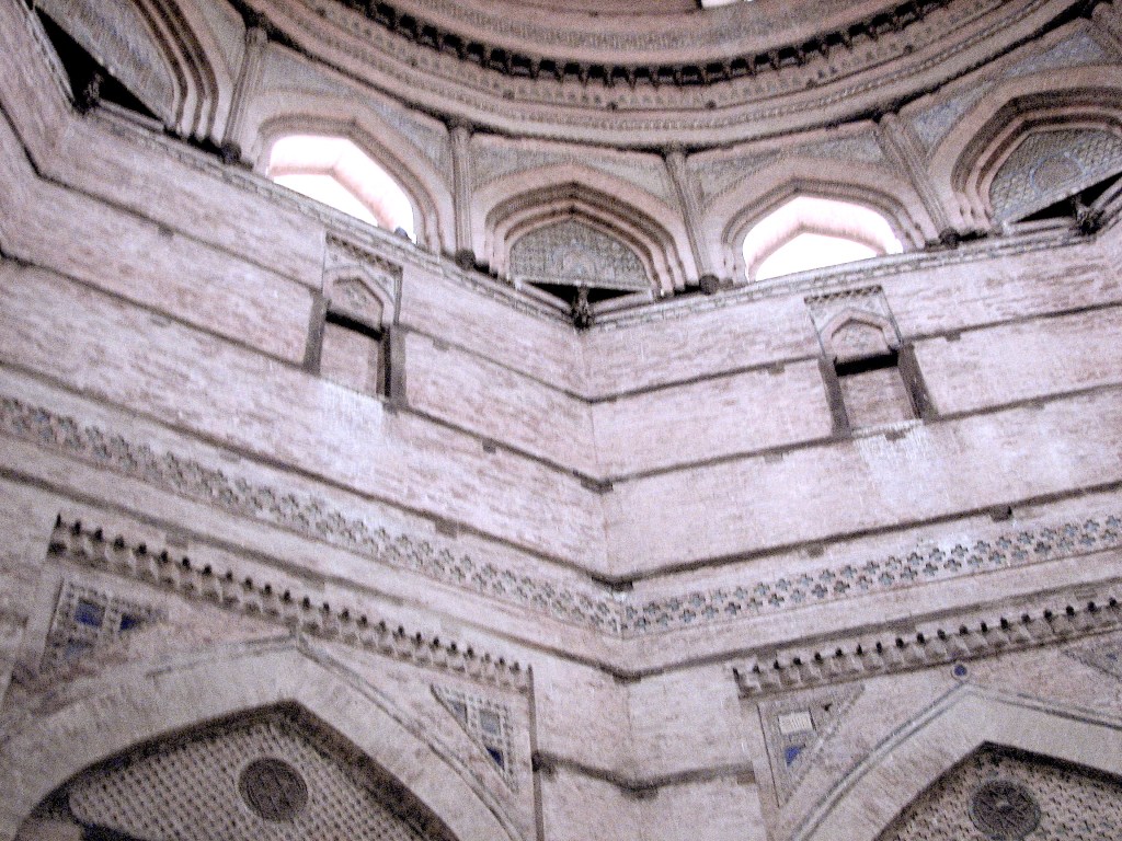 The tomb is built in three levels with an octagonal lower story, an octagonal upper level of smaller dimensions, and a crowing white squatter dome. The plain brick wall is decorated with a frieze of zangira pattern. Intricate floral carvings and Quranic inscriptions including the Ayat al-Kursi, are carved on wooden bands decorating the mihrab. The carved wooden mihrab is though to represent the earliest example of its category. The upper level, accessible via staircase, is ringed by wide open space surrounded by a parapet wall decorated with mudakhil pattern. The first storey support a hemispherical dome is highly ornate decorated with geometric, floral and arabesque designs and calligraphic motifs inspired from Central Asian and Persian tradition. The exterior is further ornamented with the use of carved brick and wood as well as blue and white faience mosaic tiles with raised relief patterns, interlocking stars, and hexagons rendered with dark blue, azure and white, glazed tiles floral tile panels, carved terracotta and string courses.
