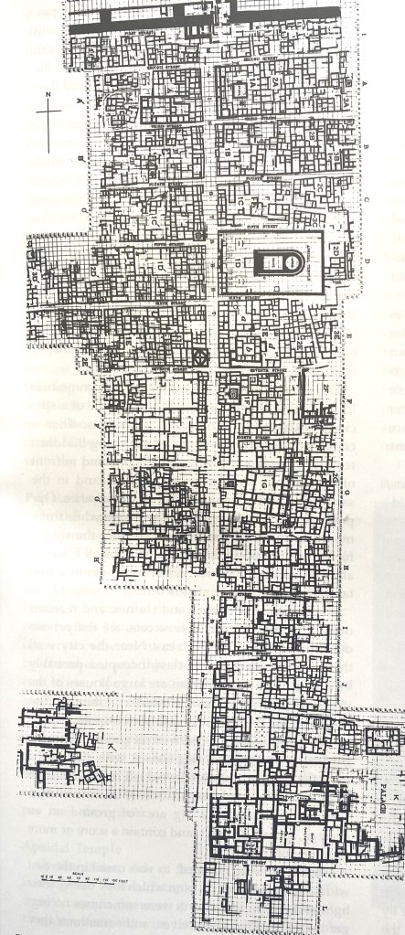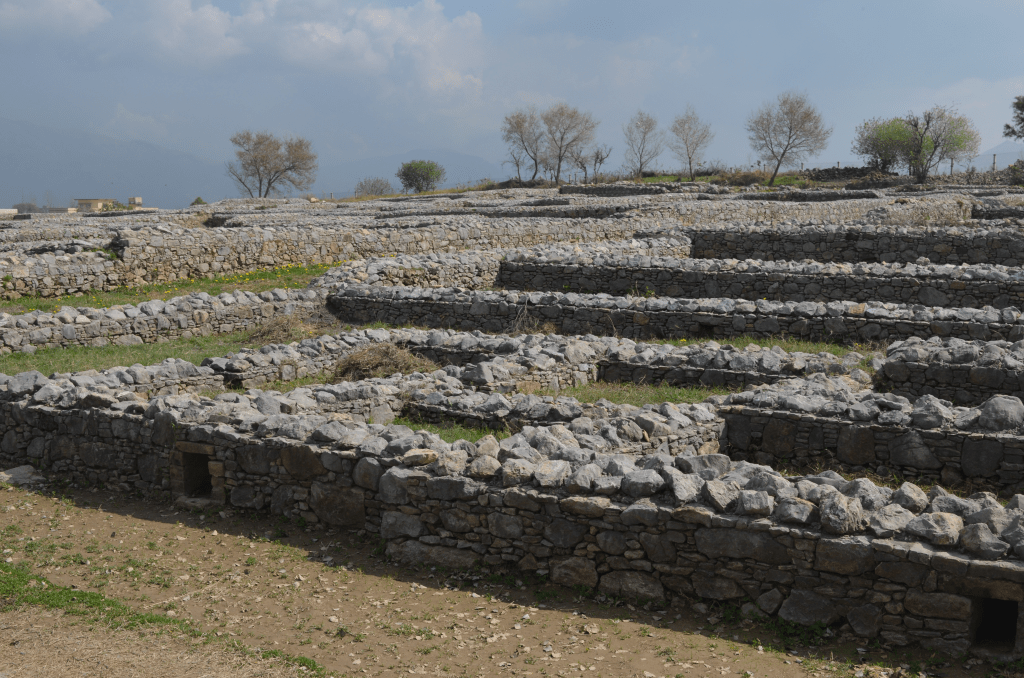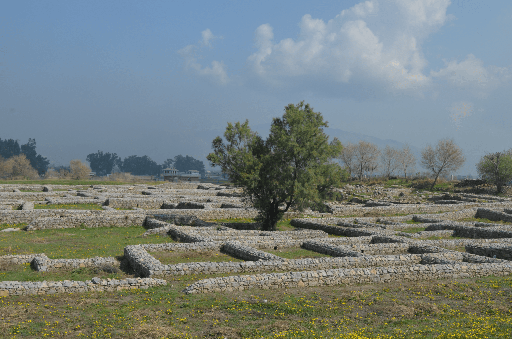 The site of Sirkap was built according to the ” Hippodamian” grid-plan practiced in ancient Greek cities of Miletus, Priene etc. It is organized around one main avenue and fifteen perpendicular streets, covering a surface of around 3,900 ft × 1,300 ft, with a surrounding wall 16–23 ft wide and 3.0 mi long.