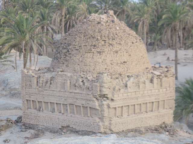 An unknown tomb were built in fairface brickwork and inspired from the Zoroastain tombs. It was built around in the middle of the sixteenth century. The tomb is square in plan and converted into sixteen-sided polygon. Finally, a tall pointed dome directly rests over the walls. The important feature of the tombs is the exterior façade which has rectangular penels. Terracota plaque tiles having a variety of geometrical patterns are clad in them. The most common features are cross, zigzag pattern, eight pointed stars within a circular ring and chain of diagonal squares, mudakhil pattern and merlons. There is also frieze of chain pattern in the exterior wall like tomb of Muhammad bin Haroon. Specially molded plugs along with burnt bricks were used in the exterior. The tomb has thick brick wall with only one opening. In the interior the walls have blind arched niches inspired from the Persian tradition. Squinch arches convert the square room into sixteen sided polygonal rooms and then smoothly transform into a circular base over which a high onion shape dome rest. The springing point of the dome is pronounced with a ring of dentil pattern. The exterior facades are vertically divided into horizontal rows of rectangular panels fitted with terracotta plaque tiles have geometrical and abstract patterns. The rectangular panels are separated by chain and zigzag patterns.
