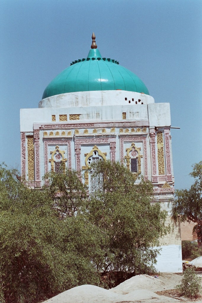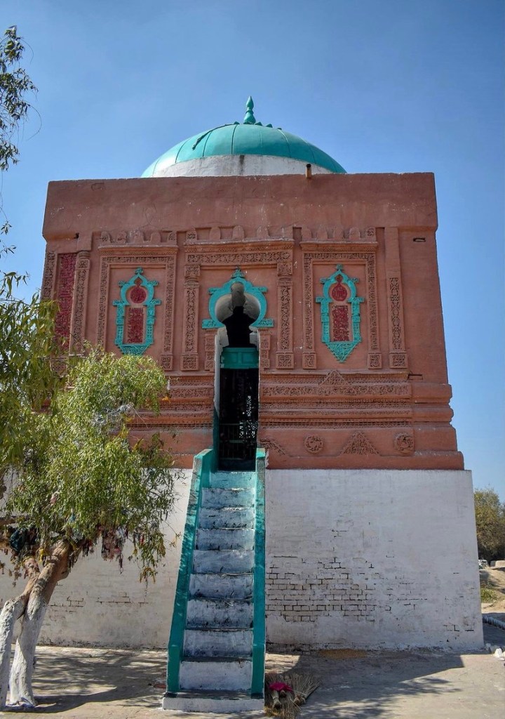 The tomb is square in plan and rests on high plinth like its contemporary town of Sadden Shaheed in Muzafar Garh District. The important features of the tombs are gwaska niches inscribed with Sura Kausar (ch.108) and sura Ikhlas (ch.112). The tomb is crowned with word Allah under a trefoil adorned with a border containing Al-Mulk-O-Lillah in Kufic script. The corners of the square plan have offsets accommodating vertical panel inscribed with qur’anic verses. The wall surface above the plinth his highly decorated with abstract vegetal motives which run all around the building. Just above the vegetal motives there are triangular patterns and below the plinth are medallions which have animal motifs of Swan, Lion, Horse, Bull, Camel, Boar each animal which are inspired from Hindu mythology. Each facade of the tomb is divided into frames, borders and gwaska niches.