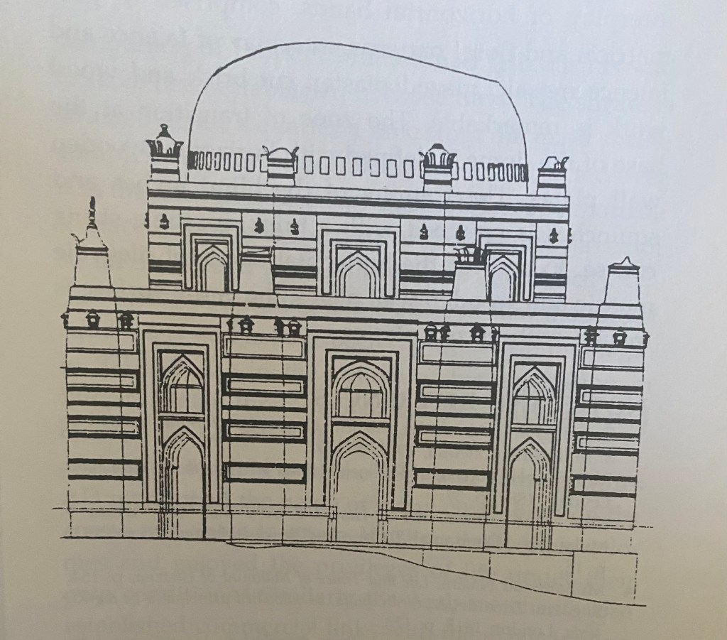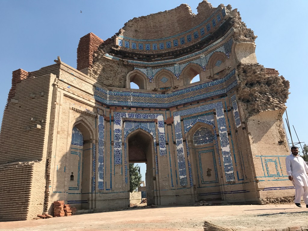 The tomb of Bibi Javindi is the most impressive ornate tomb located in an ensemble of three mausolea. The structure was built with burnt bricks and clad with glazed bricks. The tomb has an octagonal base and rise in three tiers. The tomb has octagonal base, octagonal drum and hemispherical dome with turrets on each of its eight corners. The interior is circular due to thick angled walls. Both the interior and exterior of the building are richly decorated with Islamic geometrical and floral arabesques, carved timber, and bright blue and glazed white mosaic tiles. Each corner of octagon is supported by the eight tapering turrets with flower bouquet at the top