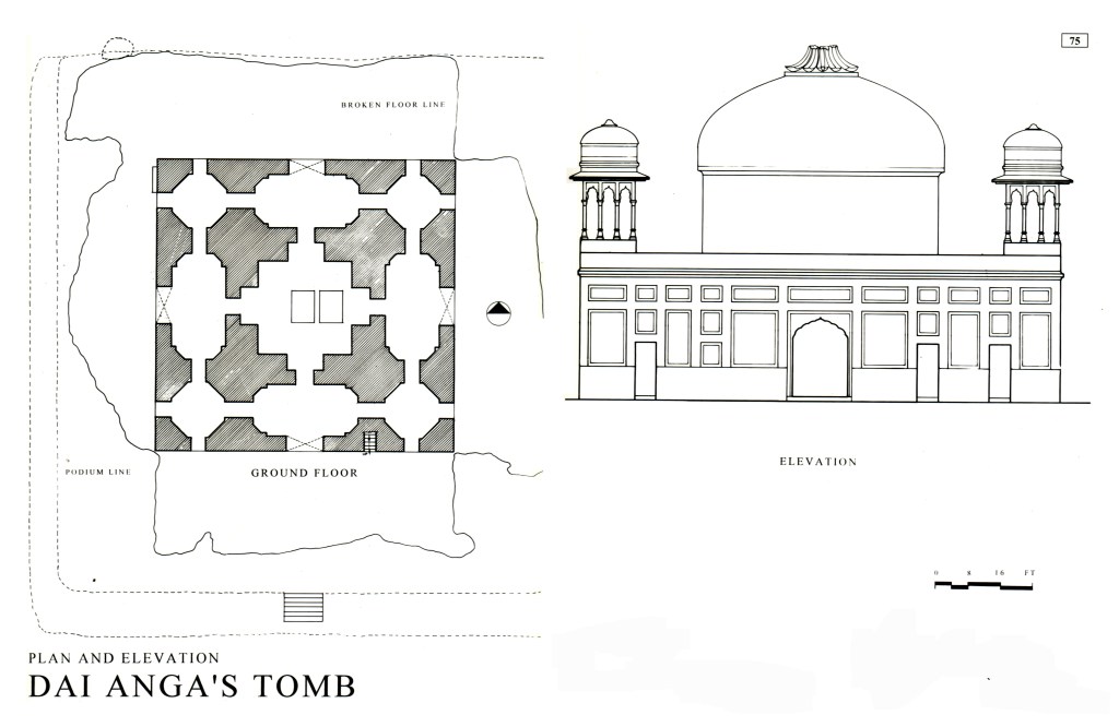 The mausoleum was built in honor of Dai Anga, the wet nurse of Shah Jahan, and wife of Murad Khan of Bikaner. The tomb was built in the middle of the garden built by the Persian nobleman Mirza Sultan Baig. The original tomb was located in the subterranean chamber which is not accessible now. She was buried next to her daughter Sultana Begum. The original garden was 250 Gaz on each side. The tomb of planned on fourfold pattern. The central chamber is covered with double dome. There are four kiosk (chatris), one in each corner of the roof. The exterior facade is divided into rectangular panels and finished with lime plaster. The parapet wall is decorated with mudakhil pattern executed in glazed tiles.