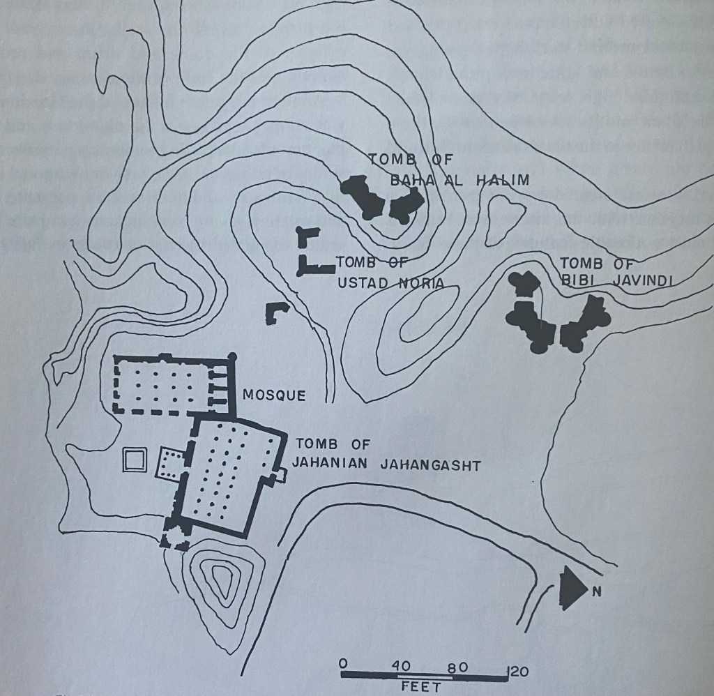 The mosque of Jahanian Jahangasht has been reconstructed around 100 years ago but southern wall and wooden doors is still intact in original condition. The mosque is rectangular in plan. It is internally 43 feet 6 inches by 33 feet 10 inches supported on12 circular columns. The mosque is located on northeastern side of the tomb of saint.