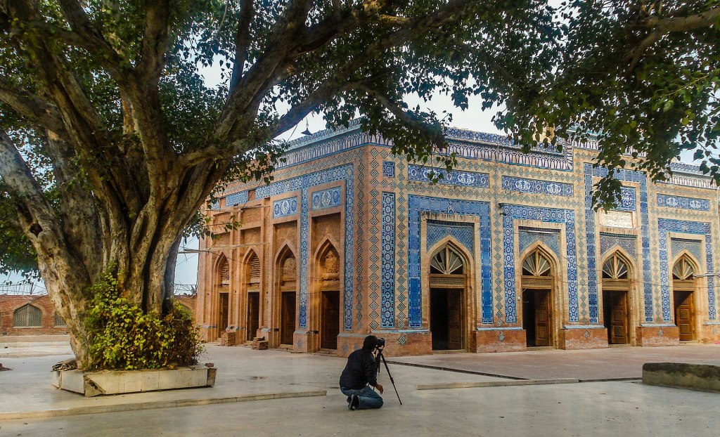 The tomb is situated on the highest contour of the town in the southwestern corner of the town. It has a rectangular plan with flat roof resting on wooden posts. The wooden pillars are similar to other flat roof tombs inspired from Central Asian wooden architecture. The distance between the pillars varies. The ceiling is decorated with lacquer paint except the ceiling over the grave of the saint which has tarseembandi decoration. The tomb adjoins the mosque and room on the western wall. The western wall is not straight rather it is leaning out towards the southwestern corner. The internal wall surfaces are plastered and divided into panels. A large panel in the western wall is finished with faience mosaic. The main entrance door is intricately carved in floral design. The wall on the other side within the porch was decorated with fresco paintings. There are four ventilators on the eastern wall having intricate wooden grills carved in geometrical designs. The entire facade of the tomb is decorated with faience and faience mosaic revetment.
