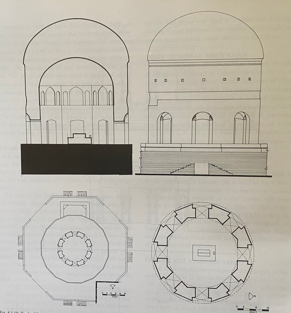The so-called tomb of Prince Pervaiz, son of emperor Jahangir, is located in a dense habitation of Boghiwal. Nothing is precisely known about the person who is buried inside the tomb. The tomb rests on a spacious platform. The building has an unusual plan. It is circular from the outside and sixteen side polygon from the inside. The cylindrical-shaped tomb has entrances on eight sides and is covered with a hemispherical dome. No other tomb of its form was constructed in the later years. Below the domes, a recessed curved rim makes the dome more pronounced. The tomb was finally finished with lime plaster.