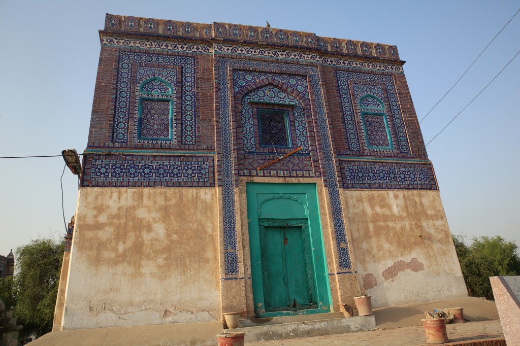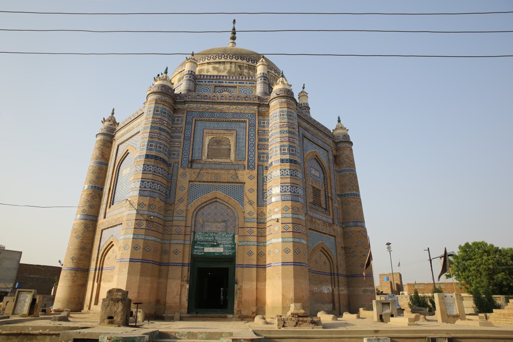 The mausoleum lies northwest of the ancient city of Multan. He was a saint of Ismaili order and one of the great grandsons of the Ismaili dai Shams Sabzwari. According to an inscription, the mausoleum was designed and executed by Ibrahim and Rajab, son of Musa Lahore. It was built in 1585 on the same principles adopted in the tomb of Shah Rukn e Alam, there the tomb is called mini Rukn e Alam. The tomb rests on square brick platform measuring 98 feet 6 inches side and 6 feet high. It is approached through a flight of steps located on western side. The mausoleum is octagonal in plan and consisted of three well-proportioned storeys making it an elegant edifice. Each side of the octagon on the ground floor is 16 feet 4 inches supported by round towers at angles. The ground floor rises to a height of 37 feet 6 inches. The inward sloping towers at the either side of western facade are octagonal in plan and profusely decorated with as many as 31 horizontal bands of glazed tiles. The other towers have simple geometrical designs. The facade of the mausoleum is such that each alternate facade has almost similar design. The NE, SE, NW and SW have two rectangular panels one above the other having four centered recessed arches. The other sides have bigger panels at lower levels and almost square panels at the top. The eastern and western facades have entrances in such openings. Each face of the octagon has received different treatment for decoration. A long horizontal band turns horizontally runs horizontally at the top of these panels on which genealogical details of the saint is recorded. The paprapet wall has a crenelation of blind recessed merlons each having the word (Allah) in the center.