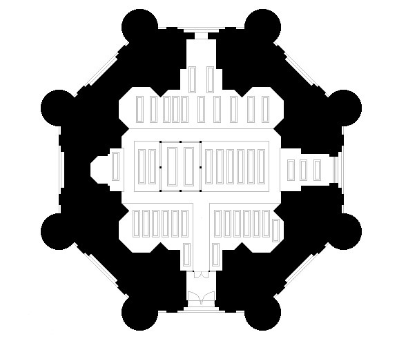 The first floor is also octagonal in plan and strengthen with corner towers but smaller than the ground floor and crowned with turrets, thus leaving circumambulation space on all sides. The second story has been treated with faience mosaic revetment. Each octagonal face is horizontally divided into three oblong recessed panels divided by thin flat brick borders. The central panels incorporate four centered arch and has an opening. A frieze consisted of cartouches and stars runs alternately above the oblong panels. Finally, the low-neck drum and dome rest on first storey.